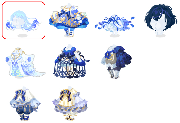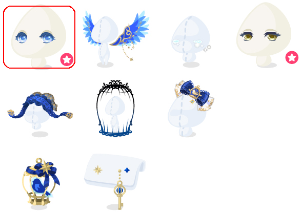 ★幸福を願う彼女の瞳(顔パーツ) ☆幸福を詠う青い鳥の翼 ☆理由もなく流れる涙 ☆幸福を求める彼の瞳(顔パーツ) 慈愛の青いヘッドドレス とらわれの鳥かごフレーム 鳥かごチャームリボン とらえては消える青い小鳥 追憶の鍵の耳飾り