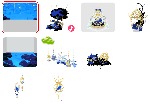 ★鳥かご王宮の壁 ☆青い鳥のメモワール(ネイロアイテム) ☆安息の鳥かごベッド ☆憧憬の鳥かごチェア 鳥かご王宮の床 追想の鳥かごプランター 忘却の鳥かごトイレ 幻影の潜む鳥かご 神秘の羽の鳥かご