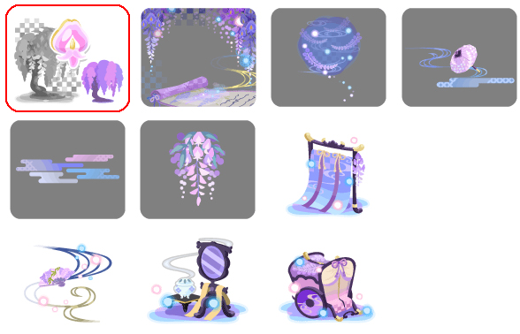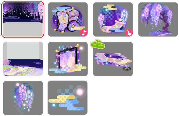 ★たまゆらの夜藤の壁 ☆夜藤への憧憬(ネイロアイテム) ☆幻想へ誘う巻物寝台(アクションアイテム) ☆夢幻に揺れる藤 たまゆらの夜藤の床 藤香る衣紋掛け風呂 夢幻の間プランター 揺らめく光の藤 たゆたう雲の手水