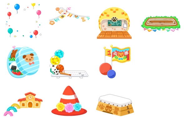 ☆ペット運動会開会の空 ☆運動会お空の彩り ☆ペットの教室の星 ペットグラウンドの丘 おべんとドア いろいろ運動用具の階段 ペット応援旗 ペットの校舎 お花のコーン 肉球跳び箱