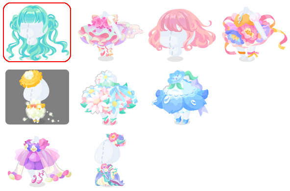 ★うららかフラワリーロング ☆思いやりのアルメリア(アクション付きfアイテム) ☆春色フェアリーボブ ☆無邪気なアネモネ(アクション付きfアイテム) 純真無垢なたんぽぽ 信頼のマーガレット 可憐なネモフィラ いつも幸せなルピナス 優しいブルーム先生