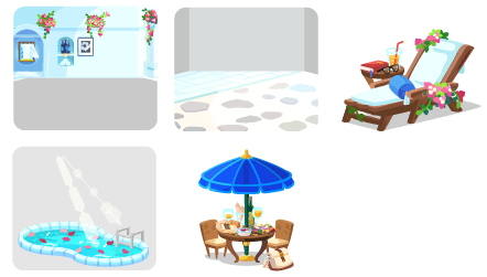 ☆エーゲ海を臨む白亜の壁 白亜のタイル貼りの床 シエスタデッキチェア 南欧の光差し込むプール 南欧料理テーブルセット