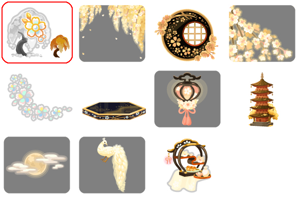 ★朧に光る枝垂金桜の木 No.791 朧月夜に浮かぶ桜甘酒朧月夜に浮かぶ桜飾りの実 ☆枝垂れそよぐ金桜の空 ☆金桜咲く漆盆の星 ☆朧に霞む金桜 ☆舞い散るらでん桜の階段 蒔絵桜と黒漆の丘 金桜照らす吊り下げ行燈 金桜散る月下の五重塔 雲間に覗く朧月 優美に佇む白孔雀 春宵の花見酒