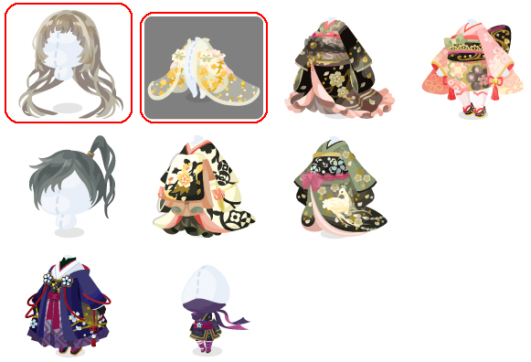 ★朧月夜の艶姫髪 ★金桜舞う姫の薄打掛 ☆金箔散らす桜の姫振袖 ☆桜市松の華振袖 ☆けぶる近侍の束ね髪 枝垂桜紋の引振袖 奥女中の孔雀模様着物 姫仕えの近侍装束 朧月夜の桜忍