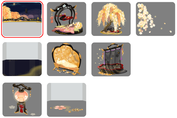 ★朧月夜の金桜の壁 ☆らでん映える薄絹の寝台 ☆静かに揺れる金桜の坪庭 ☆はらり散る金桜 蒔絵桜の黒漆の床 孔雀佇む金屏風 夜色帳の蒔絵風呂 朧に照らす桜行燈 桜の金蒔絵