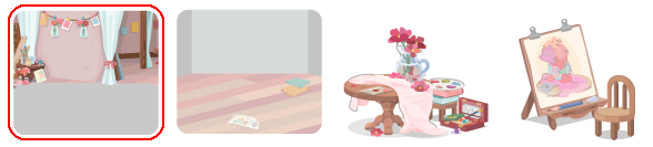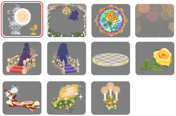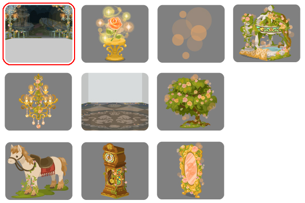 ★バラ咲く城の中庭の壁 ☆魔法の光を宿すバラ ☆城を包む魔法の光 ☆バラ咲く魔法の泉 城を照らすシャンデリア バラ咲く城の中庭の床 咲き乱れるバラの木 城に導く白馬 晩餐を告げる大時計 バラが浮かぶ魔法の鏡