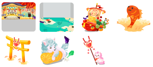 【ピックアップガチャで復刻】 ・2019.01.08〜2019.01.21 『ミコガール☆コレクション』 ( 秋の稲穂色鳥居・豊作祈願神社の鳥居・豊作御礼!秋の味覚の空 豊作ハート米俵の星・豊作祝いの舞・あ・豊作祝いの舞・うん ミコミコ秋色おさげ・マジカル豊穣ガール・変身!狛犬仮装セット 秋色豊穣アクセ・豊穣を祝う実りの幸) 【イベントで復刻】 ・2022.12.27〜2023.01.04『ぽけころ祭〜年越し冬祭り〜』