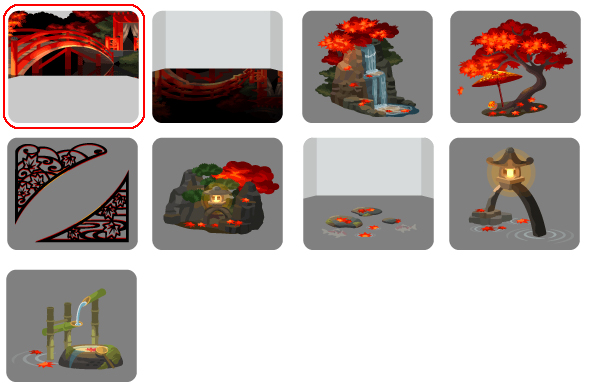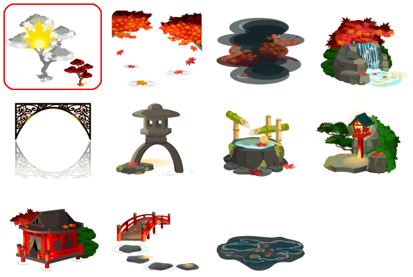 ★宵染め紅葉の壁 ☆宵染め紅葉の床 ☆紅葉踊る二段滝 ☆紅葉と隠れ傘のベッド 紅葉の透かし彫り欄間 宵に浮かぶ石庭 紅葉揺らぐ飛び石 水面を照らす灯篭 鹿威しのトイレ