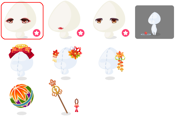 ★宵染め紅葉の瞳(顔パーツ) ☆ほんのり紅さす唇(顔パーツ) 香染紅葉の瞳(顔パーツ) ひらり舞うひとひらの紅葉 宵染め紅葉のリボン飾り 紅葉染めの花かんざし 宵染め紅葉のしだれ髪飾り お嬢さんの落とした手毬 紅葉寺の錫杖と数珠