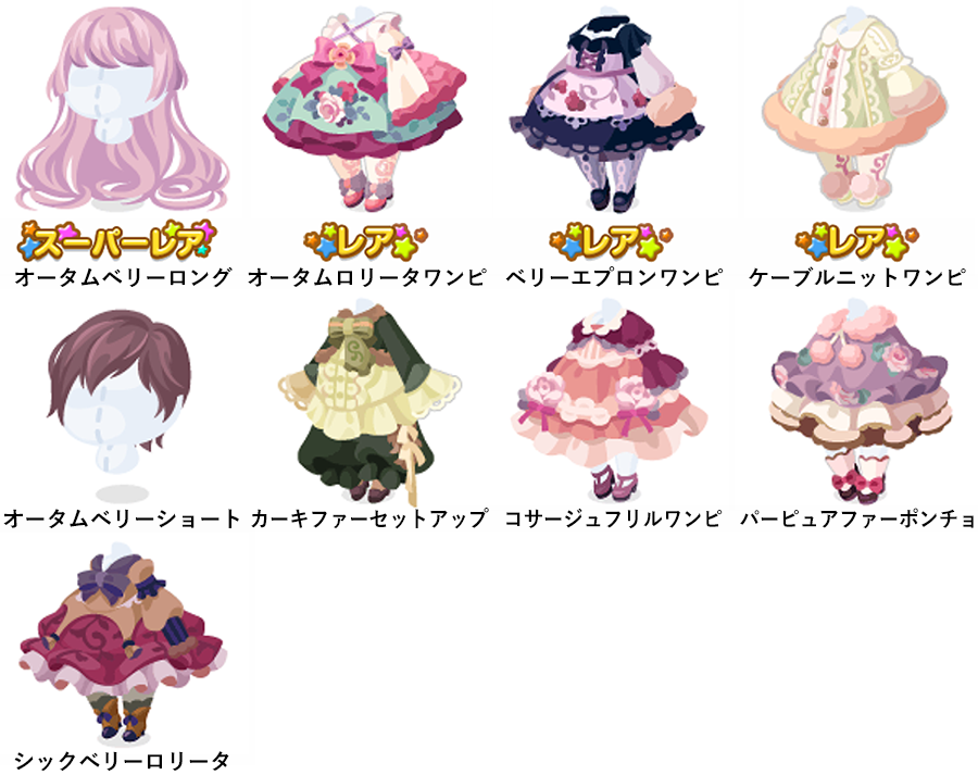 【イベントで復刻】 ・2017.12.11〜12.17 『バスタイムマシン あったかお風呂にアイスを添えて』 ・2019.09.21〜2019.09.22 , 2019.09.26〜2019.09.27 『8thポケコロ博覧会〜ベスト・オブ・ロリータ〜』 (・オータムベリーの壁(6000) ・オータムベリーの床(1000) ・オータムベリーロング(4000) ・オータムロリータワンピ(1000) ・オータムフラワーボンネット(1000) のみ復刻 ) ・2021.09.25〜10.05 『バスタイムマシン〜もう10周年らしいんだぶ〜』 【ピックアップガチャで復刻】 ・2022.07.16〜2022.07.18 『アイテムMIX ネネちゃんガチャ』 ( オータムレンガのトイレ・おそろいフェレットの口 のみ復刻)