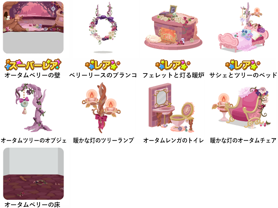 ★オータムベリーの壁 ☆ベリーリースのブランコ ☆フェレットと灯る暖炉 ☆サシェとツリーのベッド オータムツリーのオブジェ 暖かな灯のツリーランプ オータムレンガのトイレ 暖かな灯のオータムチェア オータムベリーの床