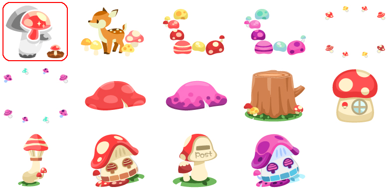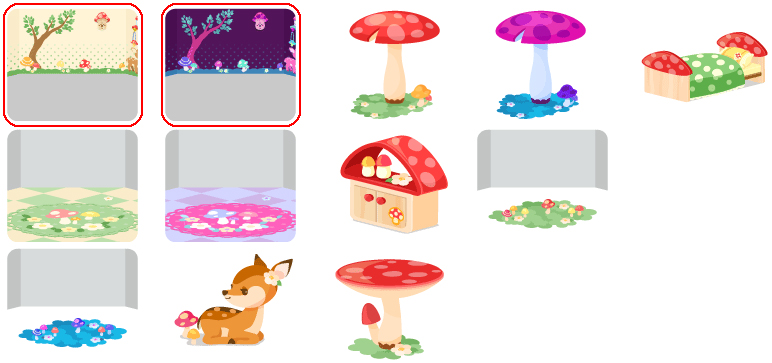 ★きのこと小鹿の壁 ★毒きのこと小鹿の壁 ☆大きなきのこのお風呂 ☆大きな毒きのこのお風呂 ☆真っ赤なきのこのベッド きのことお花の床 毒きのことお花の床 真っ赤なきのこのチェスト きのことお花のラグ 毒きのことお花のラグ おすわり小鹿 真っ赤なきのこのテーブル