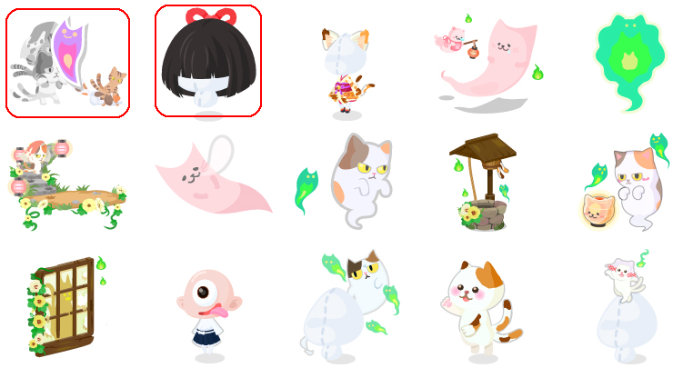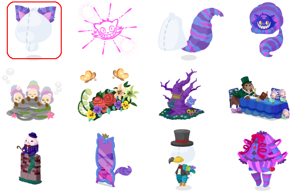 ★チェシャ猫のねこみみ ☆不思議の国の打ち上げ花火 ☆チェシャ猫のしっぽ チェシャ猫トリックスター 哀れなオイスター パンとバターフライ 神出鬼没なチェシャ猫の木 セイウチとカキの食卓 塀の上のハンプティ 鏡の国の鏡 涙の海のドードー くるくるリボンチェシャ猫