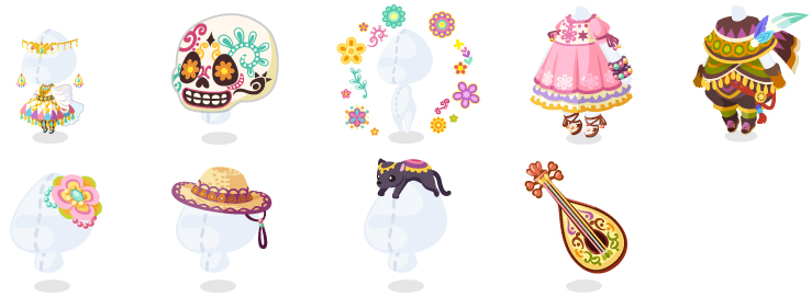 ☆祝祭の踊り子ドレス ☆祝祭のカラベラマスク 祝祭の花飾りフレーム フィエスタ刺繍ワンピ 風読みのトルバドゥール フィエスタ花飾り 風読みのソンブレロ 頭乗せパンテーラ 祝祭のリュート