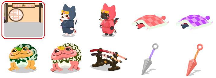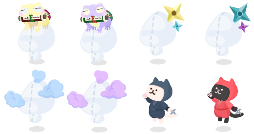 ★にゃちほこ天守 ★にゃちほこ天守 ☆中忍にゃん修行中の星 ☆中忍にゃん修行中の星 手裏剣巻物ステップ 手裏剣巻物ステップ 下忍へこたれにゃん 下忍へこたれにゃん 忍法隠れ身の扉 忍法隠れ身の扉 こっそり見守る殿の城 こっそり見守る殿の城 必殺武器の壁 必殺武器の壁 上忍ガマの助 上忍ガマの助