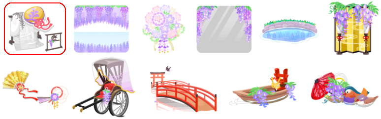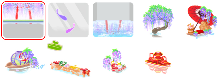 ★藤水辺の壁 ☆藤花散る木漏れ日 ☆藤水辺の床 ☆やすらぎ藤の木ベッド 花嫁の藤舟 藤のぼんぼりトイレ 神前式のプランター 藤花の飾り舟 祝言の三三九度