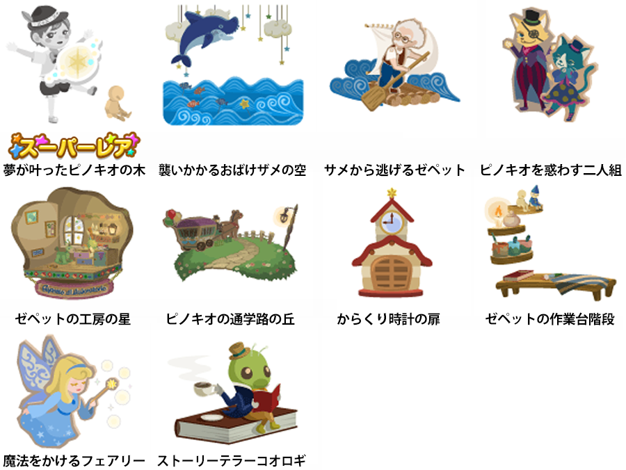 ★夢が叶ったピノキオの木 No.554 ピノキオティーセットフェアリーパウダーの実 襲いかかるおばけザメの空 サメから逃げるゼペット ピノキオを惑わす二人組 ゼペットの工房の星 ピノキオの通学路の丘 からくり時計の扉 ゼペットの作業台階段 魔法をかけるフェアリー ストーリーテラーコオロギ