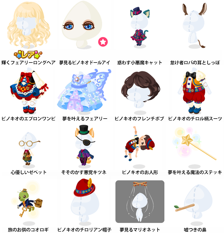 ☆輝くフェアリーロングヘア 夢見るピノキオドールアイ(顔パーツ) 惑わす小悪魔キャット 怠け者ロバの耳としっぽ ピノキオのエプロンワンピ 夢を叶えるフェアリー ピノキオのフレンチボブ ピノキオのチロル柄スーツ 心優しいゼペット そそのかす悪党キツネ ピノキオのお人形 夢を叶える魔法のステッキ 旅のお供のコオロギ ピノキオのチロリアン帽子 夢見るマリオネット 嘘つきの鼻