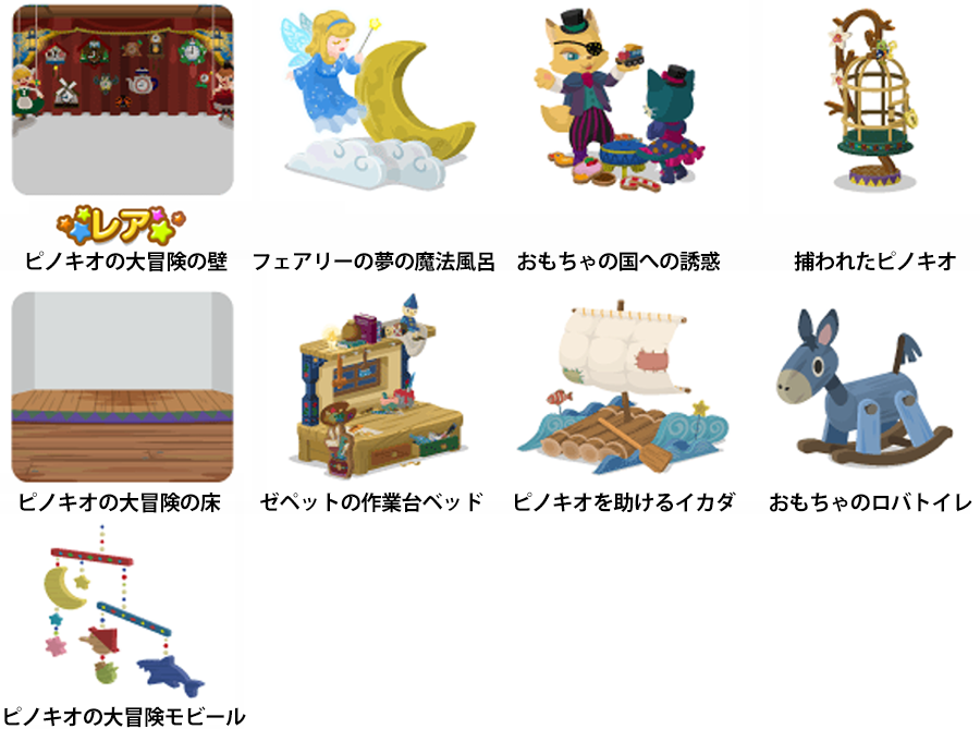 ☆ピノキオの大冒険の壁 フェアリーの夢の魔法風呂 おもちゃの国への誘惑 捕われたピノキオ ピノキオの大冒険の床 ゼペットの作業台ベッド ピノキオを助けるイカダ おもちゃのロバトイレ ピノキオの大冒険モビール