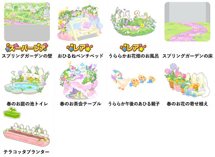 ★スプリングガーデンの壁 ☆おひるねベンチベッド ☆うららかお花畑のお風呂 スプリングガーデンの床 春のお庭の池トイレ 春のお茶会テーブル うららか午後のあひる親子 春のお花の寄せ植え テラコッタプランター