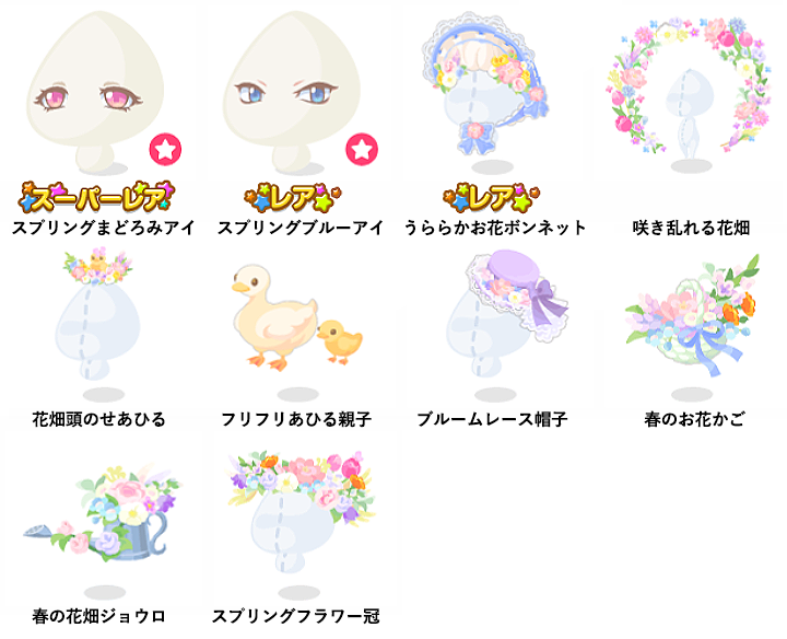 ★スプリングまどろみアイ(顔パーツ) ☆スプリングブルーアイ(顔パーツ) ☆うららかお花ボンネット 咲き乱れる花畑 花畑頭のせあひる フリフリあひる親子 ブルームレース帽子 春のお花かご 春の花畑ジョウロ スプリングフラワー冠