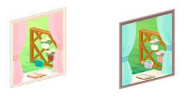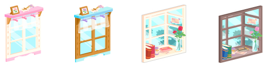 ☆ピンクカーテンベランダ窓 ☆ブルーカーテンベランダ窓 グレイウッドウィンドウ パインウッドウィンドウ 青空の小窓 夜空の小窓 カントリーピンク小物窓 カントリーブルー小物窓 景色の見える白枠出窓 景色の見える黒枠出窓