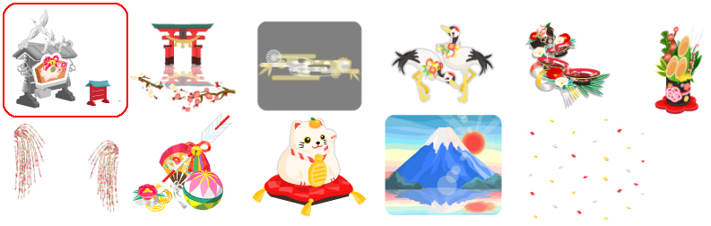 ★新春お正月絵馬の木 No.504 紅白えまぼこ新春お正月絵馬の実 水面に浮かぶ大鳥居の星 たなびく槍霞の丘 迎春舞鶴の扉 飾りお神酒の階段 新春お迎え門松 ゆれる餅花の枝 華やか賑わいお正月飾り 幸せ招く猫鏡餅 ☆迎春富士と初日の出の空 ☆賑やかお正月紙吹雪