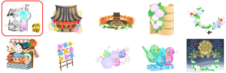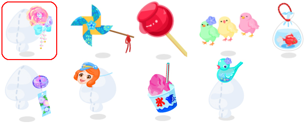 ★大輪八重華の髪飾り 夏宵風車 つやつやりんご飴 ☆ぴょこぴょこ色つきひよこ 夏宵縁日の金魚 夏宵ヨルガオ風鈴 ☆コロネちゃんのお面 夏宵縁日のかき氷 懐かしの夏宵水笛