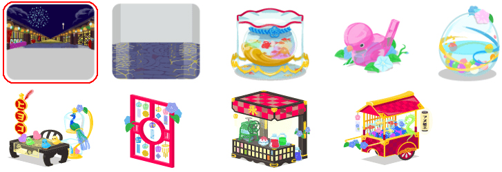 ★夏宵花火の壁 夏宵縁日の床 ☆金魚鉢のお風呂 懐かし水笛のトイレ 大きな水風船のベッド 色つきひよこ屋さんの屋台 風鈴屋さんパーテーション ☆かき氷屋さんの屋台 あめ細工屋さんの屋台