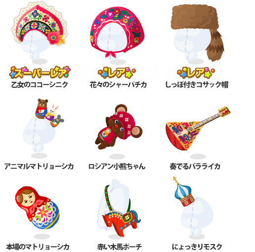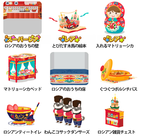【イベントで復刻】 ・2018.02.15〜02.22 『バスタイムマシン〜健康一番研究二番〜』 ・2021.01.23〜2021.01.31『バスタイムマシン〜冬のお楽しみ〜』 【通常ガチャで復刻】 ・2018.06.13〜2018.07.17『Fun in Russia』 【ピックアップガチャで復刻】 ・2019.11.18〜2019.11.30 『いい家の日』 (ロシアのおうちの壁・ロシアのおうちの床 のみ復刻)