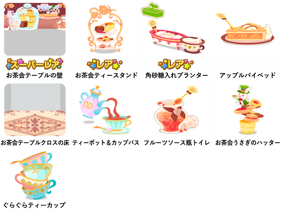★お茶会テーブルの壁 ☆お茶会ティースタンド ☆角砂糖入れプランター アップルパイベッド お茶会テーブルクロスの床 ティーポット&カップバス フルーツソース瓶トイレ お茶会うさぎのハッター ぐらぐらティーカップ