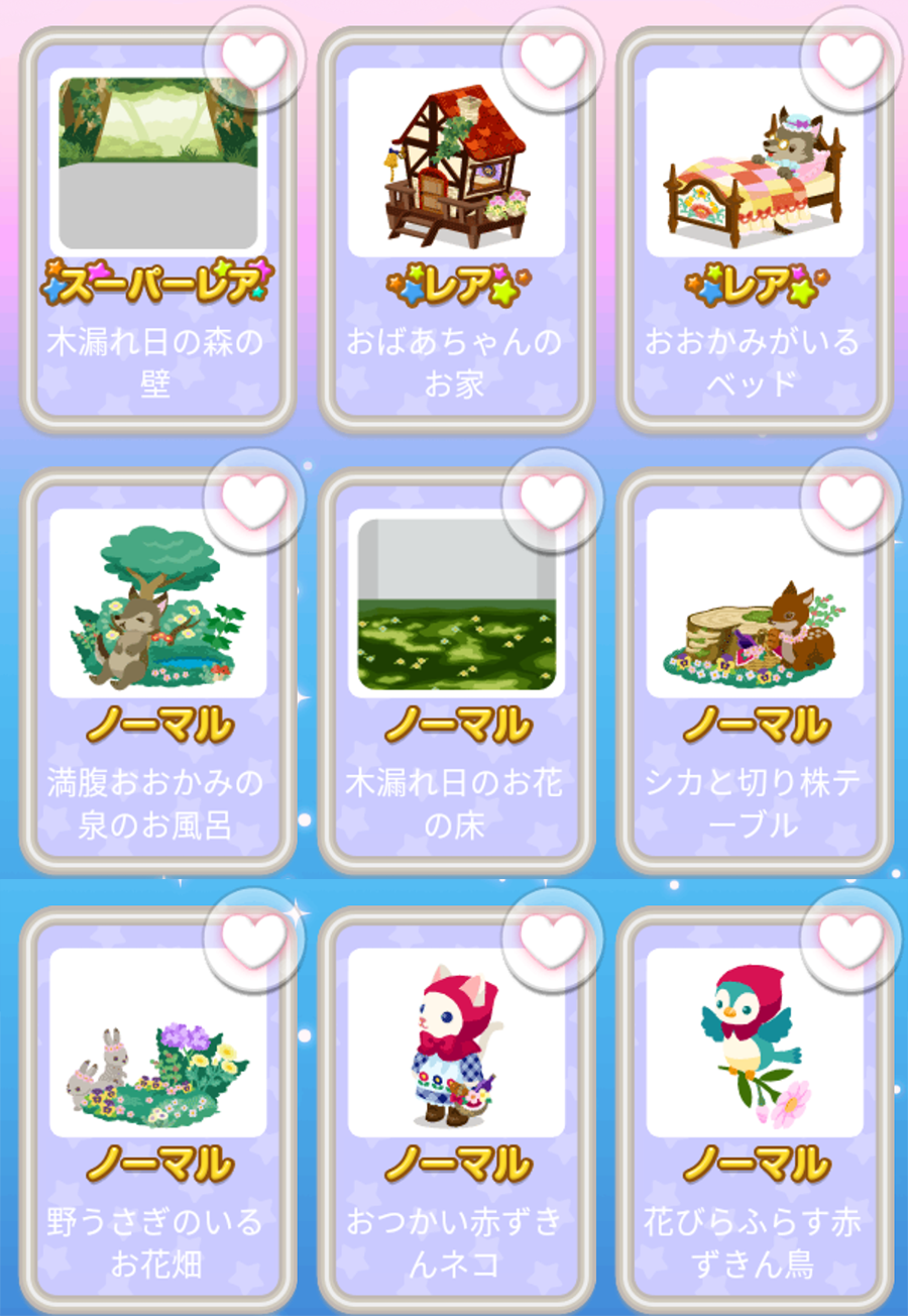 ★木漏れ日の森の壁 ☆おばあちゃんのお家 ☆おおかみがいるベッド 満腹おおかみの泉のお風呂 木漏れ日のお花の床 シカと切り株テーブル 野うさぎのいるお花畑 おつかい赤ずきんネコ 花びらふらす赤ずきん鳥