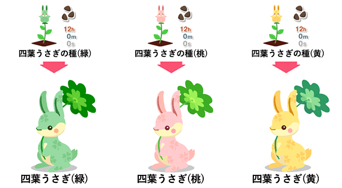 四葉うさぎの種(緑) → 四葉うさぎ(緑) 四葉うさぎの種(桃) → 四葉うさぎ(桃) 四葉うさぎの種(黄) → 四葉うさぎ(黄)