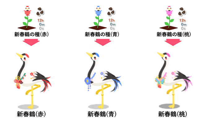 新春鶴の種(赤) → 新春鶴(赤) 新春鶴の種(青) → 新春鶴(青) 新春鶴の種(桃) → 新春鶴(桃)