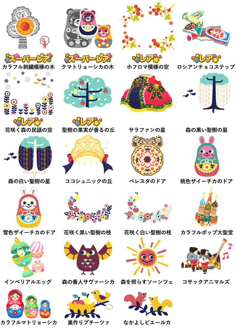 ★カラフル刺繍模様の木 No.325 ロシアンクッキーケーキ ロシア伝統刺繍の実 ★クマトリョーシカの木 No.756 クマトリョーシカ中華丼 クマトリョーシカの実 ☆ホフロマ模様の空 ☆ロシアンチョコステップ ☆花咲く森の民謡の空 ☆聖樹の果実が香るの丘 サラファンの星 森の黒い聖樹の星 森の白い聖樹の星 ココシュニックの丘 ベレスタのドア 桃色ザイーチカのドア 雪色ザイーチカのドア 花咲く黒い聖樹の枝 花咲く白い聖樹の枝 カラフルポップ大聖堂 インペリアルエッグ 森の番人サヴァーシカ 森を照らすソーンツェ コサックアニマルズ カラフルマトリョーシカ 巣作りプチーツァ なかよしビエールカ