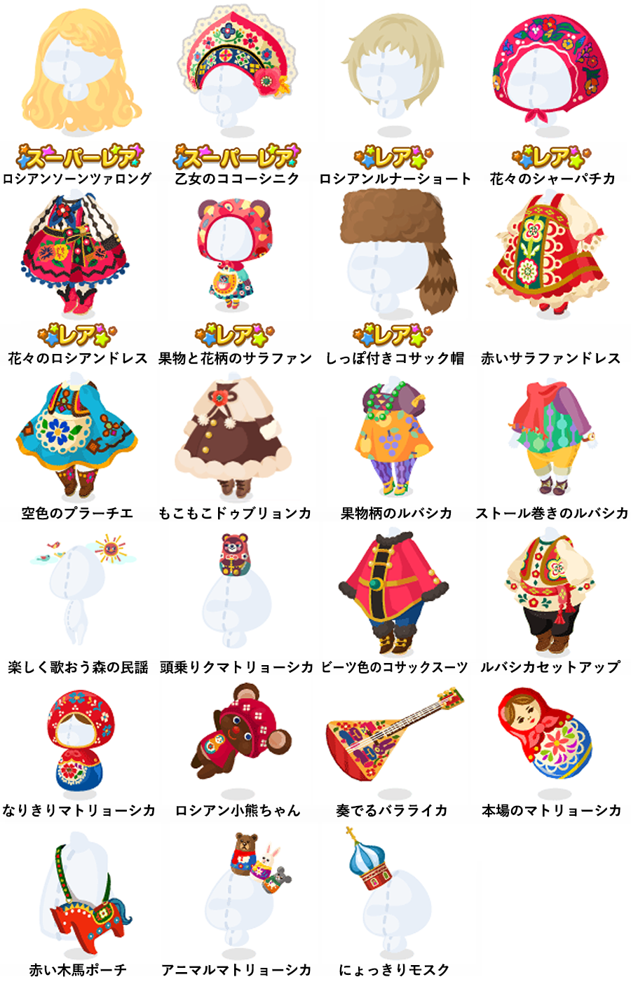 ★ロシアンソーンツァロング ★乙女のココーシニク ☆ロシアンルナーショート ☆花々のシャーパチカ ☆花々のロシアンドレス ☆果物と花柄のサラファン ☆しっぽ付きコサック帽 赤いサラファンドレス 空色のプラーチエ もこもこドゥブリョンカ 果物柄のルバシカ ストール巻きのルバシカ 楽しく歌おう森の民謡 頭乗りクマトリョーシカ ビーツ色のコサックスーツ ルバシカセットアップ なりきりマトリョーシカ ロシアン小熊ちゃん 奏でるバラライカ 本場のマトリョーシカ 赤い木馬ポーチ アニマルマトリョーシカ にょっきりモスク