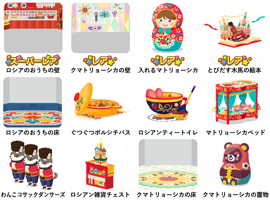 ★ロシアのおうちの壁 ☆クマトリョーシカの壁 ☆入れるマトリョーシカ ☆とびだす木馬の絵本 ロシアのおうちの床 ぐつぐつボルシチバス ロシアンティートイレ マトリョーシカベッド わんこコサックダンサーズ ロシアン雑貨チェスト クマトリョーシカの床 クマトリョーシカの置物