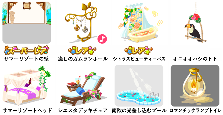 ★サマーリゾートの壁 ☆癒しのガムランボール(ネイロアイテム) ☆シトラスビューティーバス オニオオハシのトト サマーリゾートベッド シエスタデッキチェア 南欧の光差し込むプール ロマンチックランプトイレ