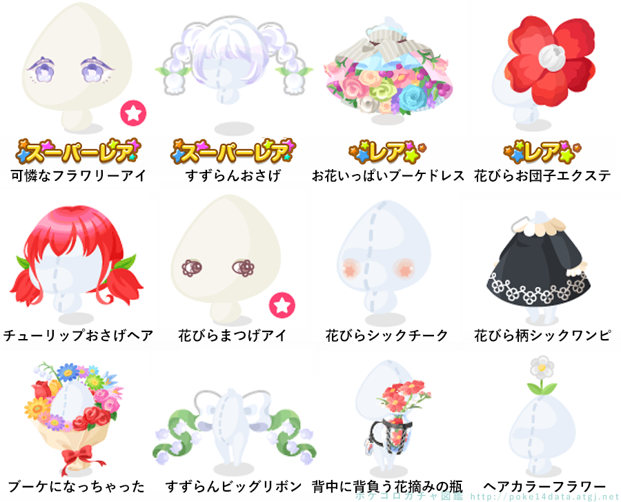 ★可憐なフラワリーアイ(顔パーツ) ★すずらんおさげ ☆お花いっぱいブーケドレス ☆花びらお団子エクステ チューリップおさげヘア 花びらまつげアイ(顔パーツ) 花びらシックチーク 花びら柄シックワンピ ブーケになっちゃった すずらんビッグリボン 背中に背負う花摘みの瓶 ヘアカラーフラワー