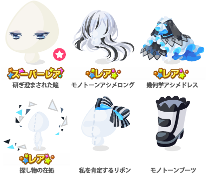 ★研ぎ澄まされた瞳(顔パーツ)(4000) ☆モノトーンアシメロング(3000) ☆幾何学アシメドレス(3000) ☆探し物の在処(1800) 私を肯定するリボン(1000) モノトーンブーツ(500)
