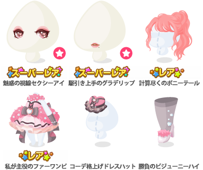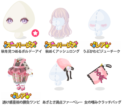 ★魅惑の視線セクシーアイ(顔パーツ)(4000) ★駆引き上手のグラデリップ(顔パーツ)(4000) ☆計算尽くのポニーテール(2800) ☆私が主役のファーワンピ(2000) コーデ格上げドレスハット(800) 勝負のビジューニーハイ(500) ★秋を見つめるボルドーアイ(顔パーツ)(4000) ★秋めくアッシュロング(4000) ☆うぶかわビジューチーク(3000) ☆透け感重視の勝負ワンピ(2000) あざとさ満点ファーベレー(500) 女の嗜みクラッチバッグ (300)