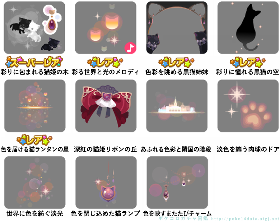 ★彩りに包まれる猫姫の木 No.1478 彩る猫耳フォンダン 深紅の猫姫チャームの実 ☆彩る世界と光のメロディ(Cネイロアイテム) ☆色彩を眺める黒猫姉妹 ☆彩りに憧れる黒猫の空 ☆色を届ける猫ランタンの星 深紅の猫姫リボンの丘 あふれる色彩と隣国の階段 淡色を纏う肉球のドア 世界に色を紡ぐ淡光 色を閉じ込めた猫ランプ 色を映すまたたびチャーム