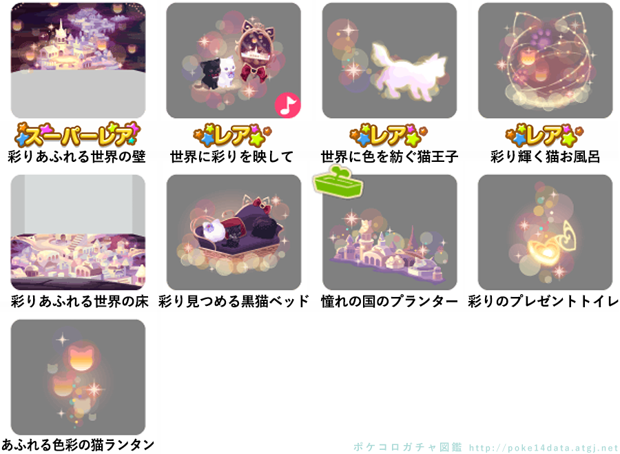 ★彩りあふれる世界の壁 ☆世界に彩りを映して(ネイロアイテム) ☆世界に色を紡ぐ猫王子 ☆彩り輝く猫お風呂 彩りあふれる世界の床 彩り見つめる黒猫ベッド 憧れの国のプランター 彩りのプレゼントトイレ あふれる色彩の猫ランタン