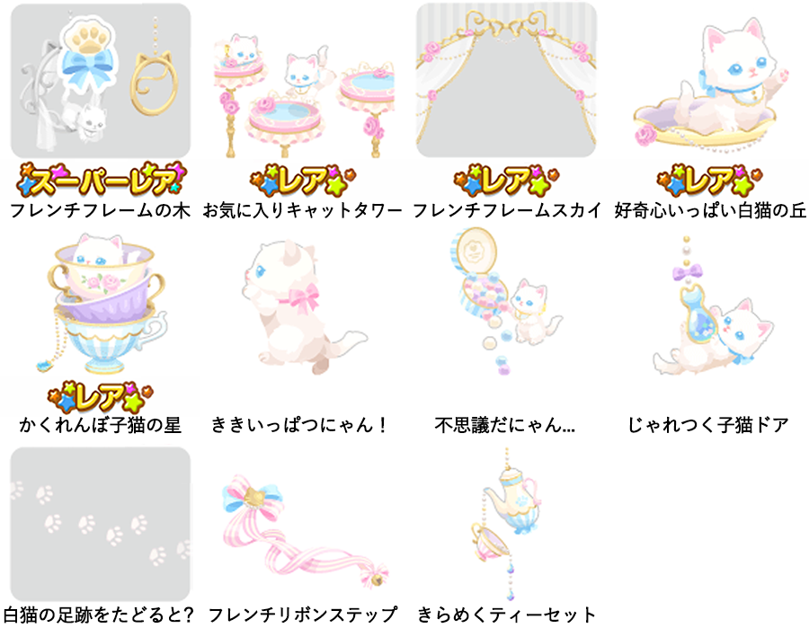 ★フレンチフレームの木 No.1081 白猫スイートティーセット 白猫のおててブローチの実 ☆お気に入りキャットタワー ☆フレンチフレームスカイ ☆好奇心いっぱい白猫の丘 ☆かくれんぼ子猫の星 ききいっぱつにゃん! 不思議だにゃん… じゃれつく子猫ドア 白猫の足跡をたどると? フレンチリボンステップ きらめくティーセット
