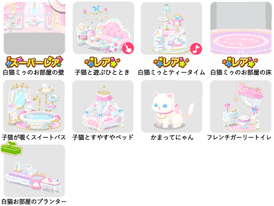 ★白猫ミゥのお部屋の壁 ☆子猫と遊ぶひととき(アクションアイテム) ☆白猫ミゥとティータイム(ネイロアイテム) ☆白猫ミゥのお部屋の床 子猫が覗くスイートバス 子猫とすやすやベッド かまってにゃん フレンチガーリートイレ 白猫お部屋のプランター