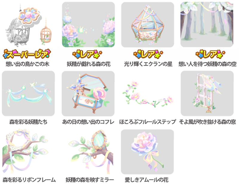 ★想い出の鳥かごの木 No.976 妖精のフルールパーワン 妖精の花飾りの実 ☆妖精が戯れる森の花 ☆光り輝くエクランの星 ☆想い人を待つ妖精の森の空 森を彩る妖精たち あの日の想い出のコフレ ほころぶフルールステップ そよ風が吹き抜ける森の窓 森を彩るリボンフレーム 妖精の森を映すミラー 愛しきアムールの花