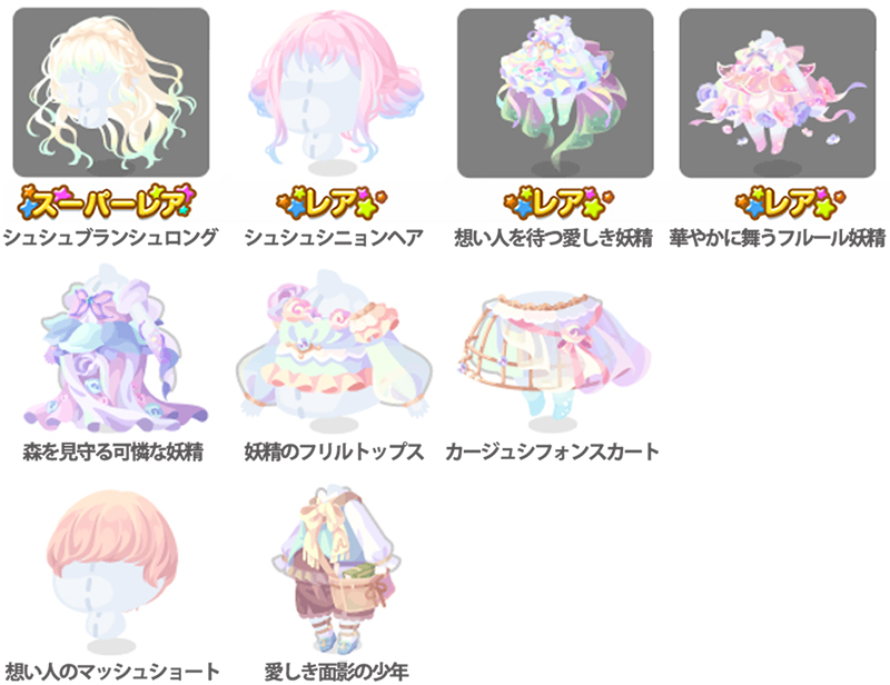 ★シュシュブランシュロング ☆シュシュシニョンヘア ☆想い人を待つ愛しき妖精(アクション付きfアイテム) ☆華やかに舞うフルール妖精(アクション付きfアイテム) 森を見守る可憐な妖精 妖精のフリルトップス カージュシフォンスカート 想い人のマッシュショート 愛しき面影の少年