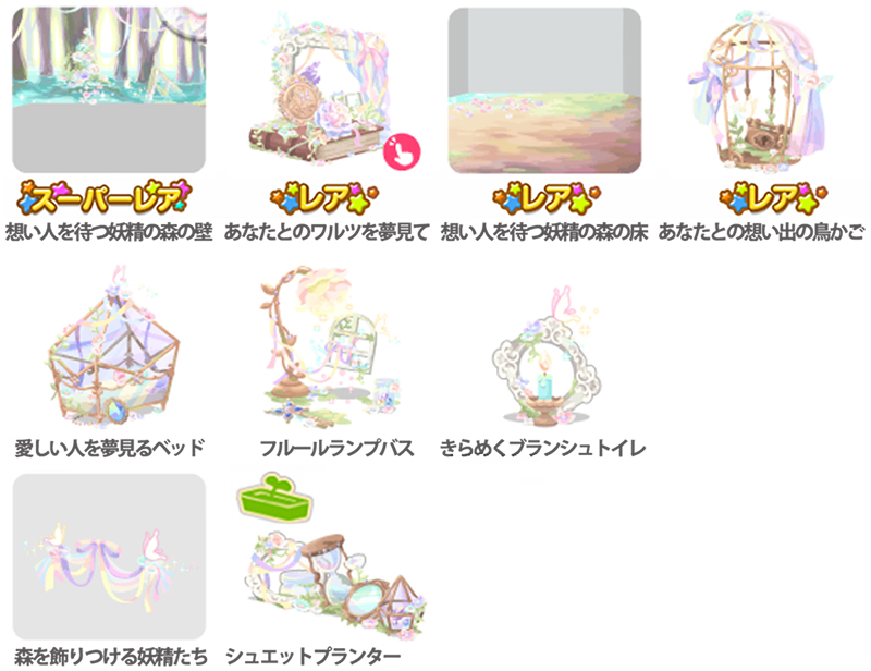 ★想い人を待つ妖精の森の壁 ☆あなたとのワルツを夢見て(アクションアイテム) ☆想い人を待つ妖精の森の床 ☆あなたとの想い出の鳥かご 愛しい人を夢見るベッド フルールランプバス きらめくブランシュトイレ 森を飾りつける妖精たち シュエットプランター