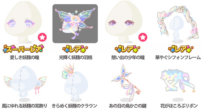 ★愛しき妖精の瞳(顔パーツ) ☆光輝く妖精の羽根 ☆想い出の少年の瞳(顔パーツ) ☆華やぐシフォンフレーム 風にゆれる妖精の耳飾り きらめく妖精のクラウン あの日の鳥かごの鍵 花がほころぶリボン