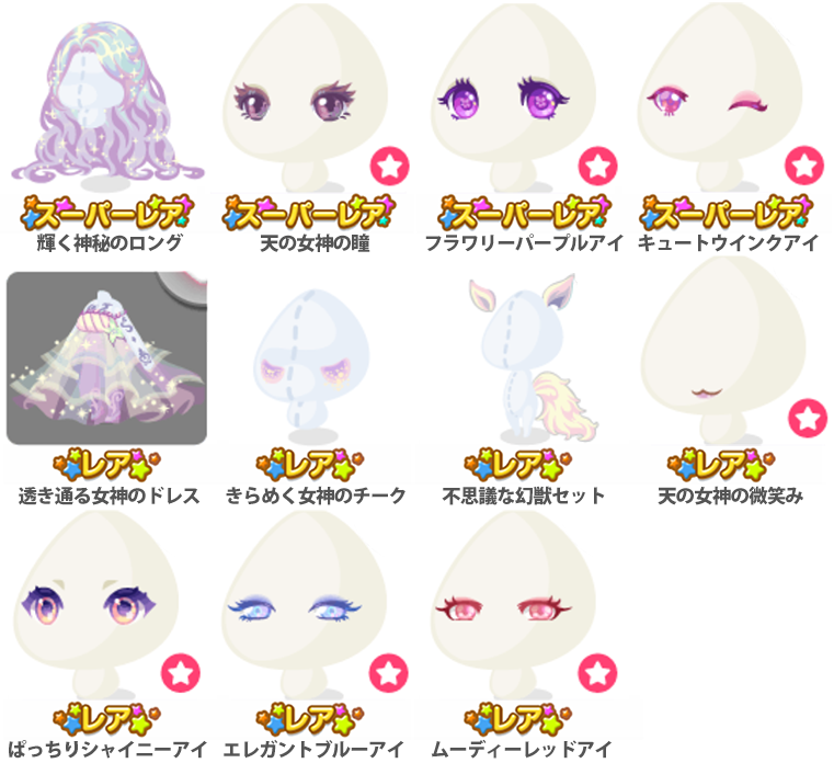 ★輝く神秘のロング ★天の女神の瞳(顔パーツ) ★フラワリーパープルアイ(顔パーツ) ★キュートウインクアイ(顔パーツ) ☆透き通る女神のドレス ☆きらめく女神のチーク ☆不思議な幻獣セット ☆天の女神の微笑み(顔パーツ) ☆ぱっちりシャイニーアイ(顔パーツ) ☆エレガントブルーアイ(顔パーツ) ☆ムーディーレッドアイ(顔パーツ) 輝く女神の杖 不思議な力を秘めたツノ 天の女神に仕える幻獣 天の宝石の髪飾り ぷっくりセクシーリップ(顔パーツ) 優しい微笑みリップ(顔パーツ) クールな流しアイ(顔パーツ)